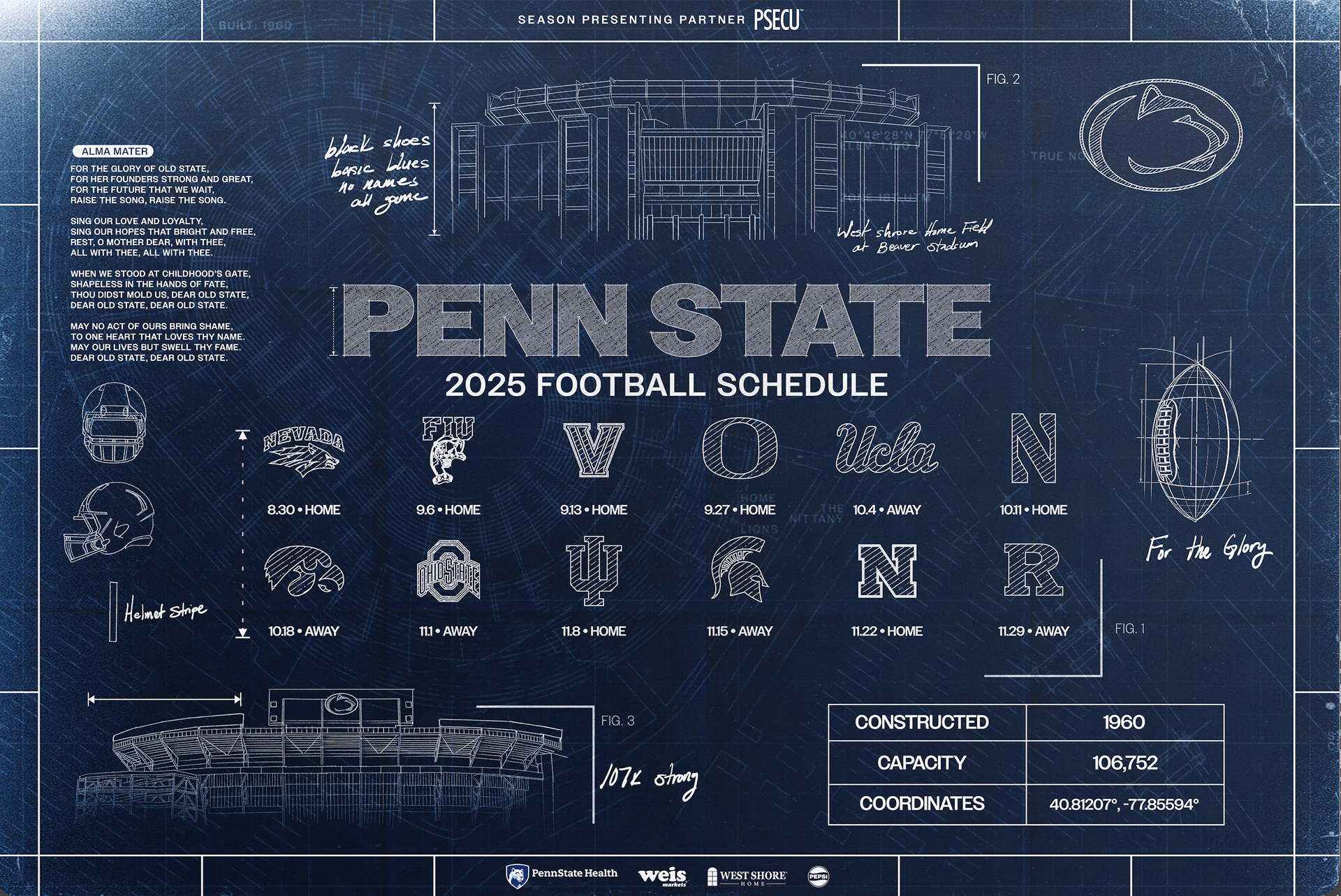 This design is extremely personal to me, as I hand-drew many of the elements within the piece. My goal was to create something that felt deeply connected to our fan base, knowing Beaver Stadium is an iconic landmark for Penn Staters. At Penn State, tradition runs deep and fans often resist change, which made it important to balance history with progress. The schedule poster is one of the most anticipated releases each year, and I’ve experienced firsthand how challenging launches can be if the design doesn’t resonate. Heading into what we believed could be a national championship run, I wanted to create something that was not only personal to me but also meaningful to our entire fan and alumni base. Each element in the design reflects both past and present—the Alma Mater as a nod to tradition, hand-drawn renderings of Beaver Stadium to capture what it has been and what it will become, and the iconic helmet stripe as a timeless symbol of identity. Together, these details tie old and new, with the hope of fostering community and inspiring acceptance of change.
